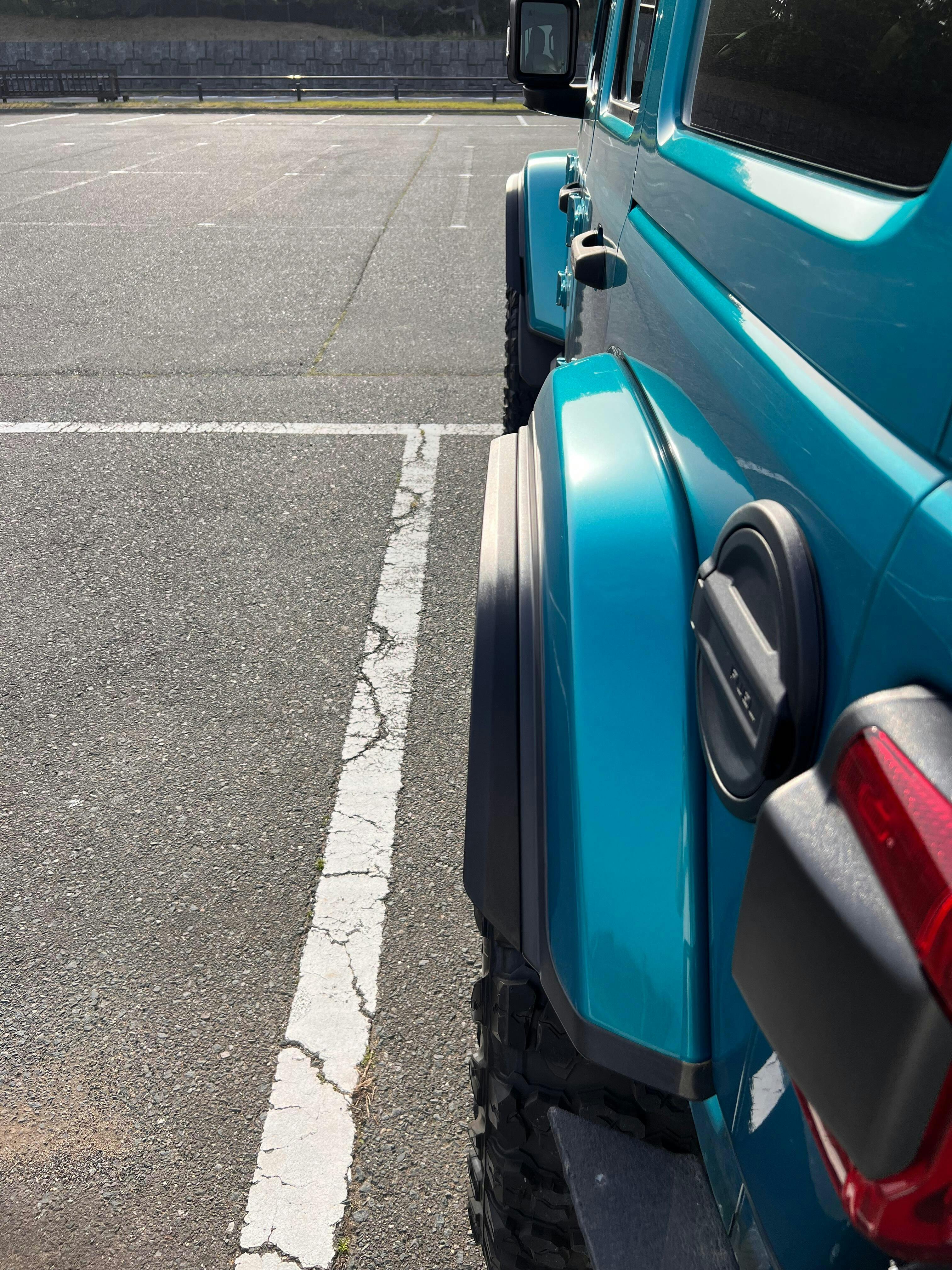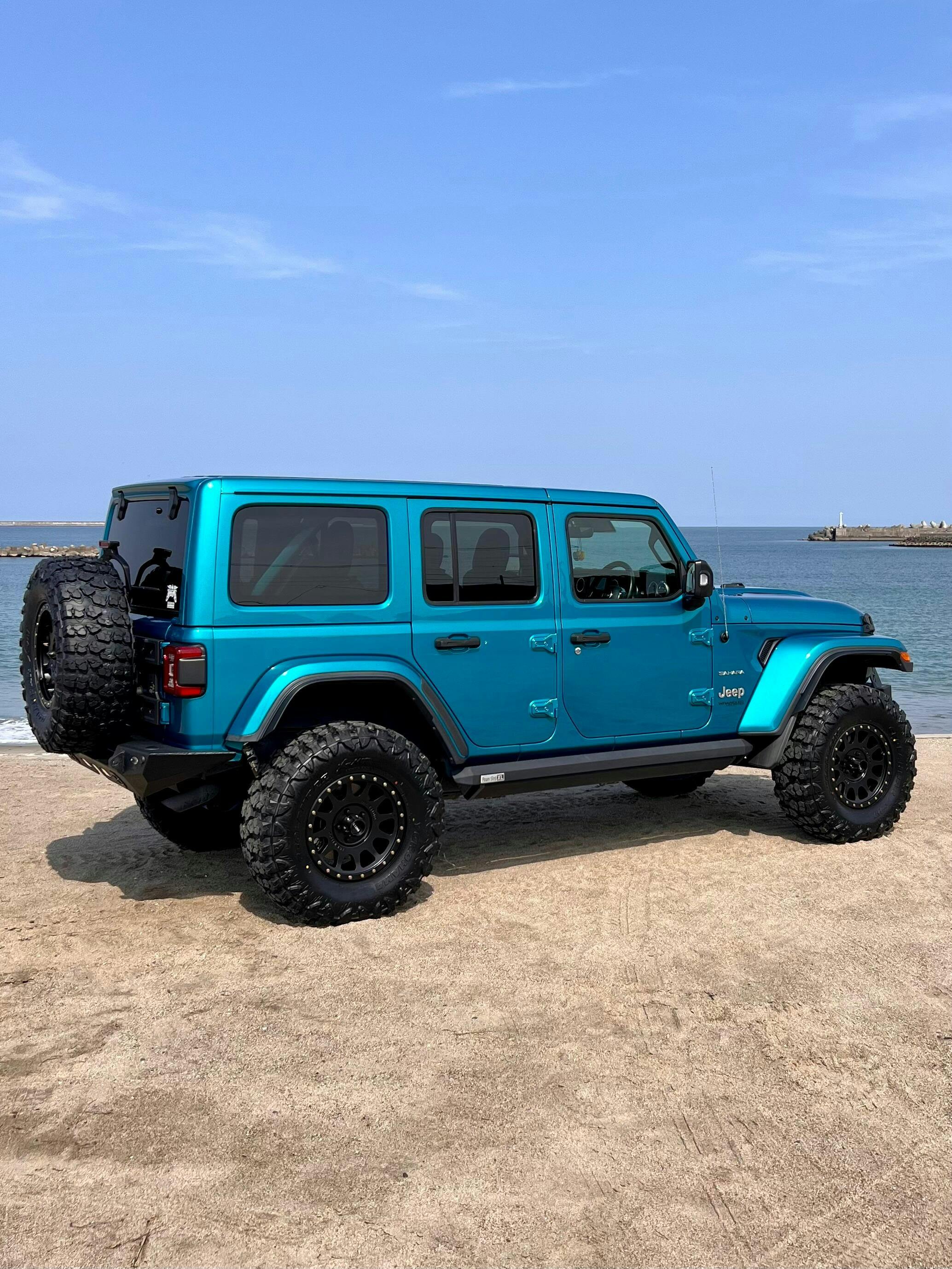 タイヤは、GEOLANDAR X-MT G005 35×12.50R17で、JLラングラーサハラの純正フェンダーに、Amazonで購入した格安フェンダーフレア(幅約25mm)を付けてツライチ状態です。