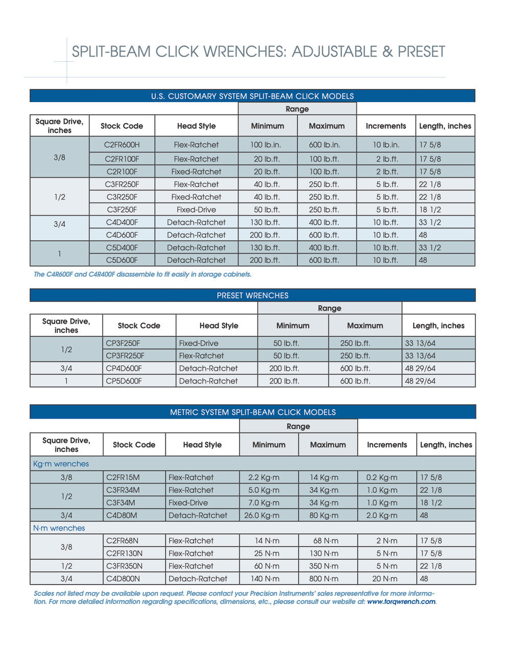 Precision Instruments プレシジョンインスツルメンツ 1/2" ドライブプリセットスプリットビームクリックレンチ - CP3FR250F